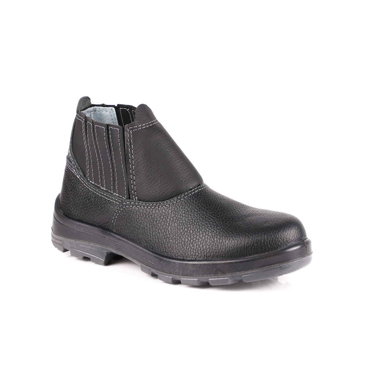 Botina de proteção com elástico lateral, com dorso acolchoado, confeccionado em couro estampa relax, forração interna da gáspea em não tecido e forro do cano em tecido com alto poder de absorção. Biqueira plástica conformada, palmilha de não tecido e sobre-palmilha de eva. Solado em poliuretano (pu) bidensidade, constituído por duas camadas, injetado diretamente ao cabedal. Calçado que proporciona conforto.